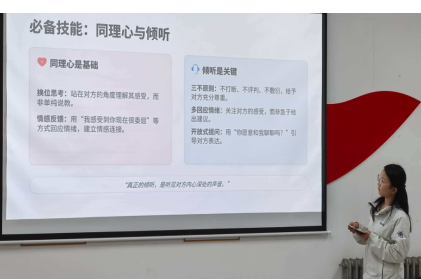 培训会上,苗丽敏同学围绕如何成为优秀心理委员,系统讲解了心理委员的角色定位、核心职责与工作价值。分享明确了心理委员作为倾听者、陪伴者、引导者与宣传员的核心身份,厘清了与专业心理工作者的边界,同时详细介绍了同理心、倾听、情绪识别、危机预警与规范转介等必备技能。最后苗丽敏同学倡导大家以专业与爱心履行职责,将雷锋精神与志愿理念融入日常,共同营造温暖和谐的校园心理氛围,守护同学心灵健康。