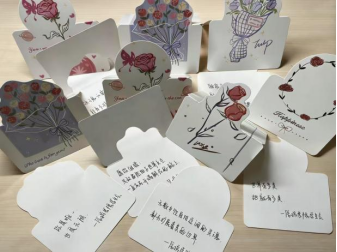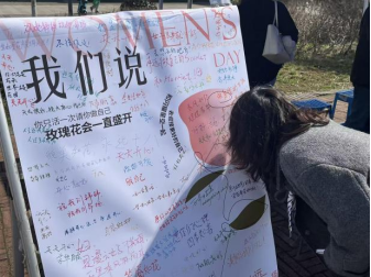 参与活动的同学被邀请写下心中所念,为每一位女性带来节日中的期盼和惊喜。通过一纸心意与各式鲜花,以文字为载体,以花香为媒介,传递对女性们为生活独立,为梦想拼搏,充满智慧与韧劲的礼赞。
