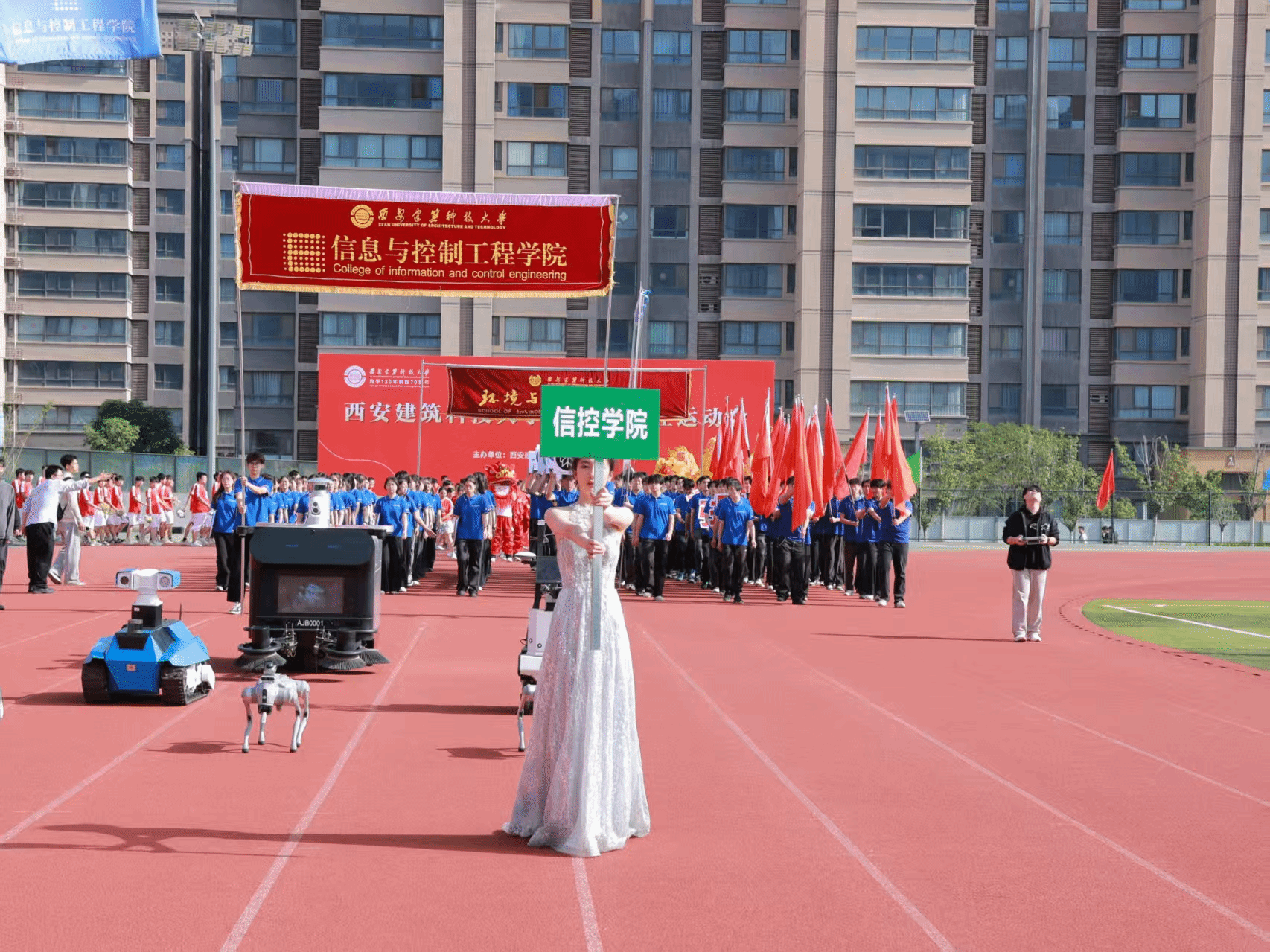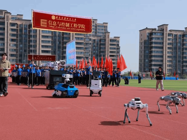 运动员代表队步履坚定,意气风发。在机器狗及从信控楼停机坪起飞的无人机空天地全景护航下,学院师生自主研制的园区清扫巡检机器人、大空间场所智能消防灭火机器人、建筑施工钢筋捆扎机器人等组成的智能装备方队依次驶过,充分展现了专业特色,彰显了学科内涵。运动员方阵入场后,学院的阳光体育活动方案在开幕式上进行了表演。
