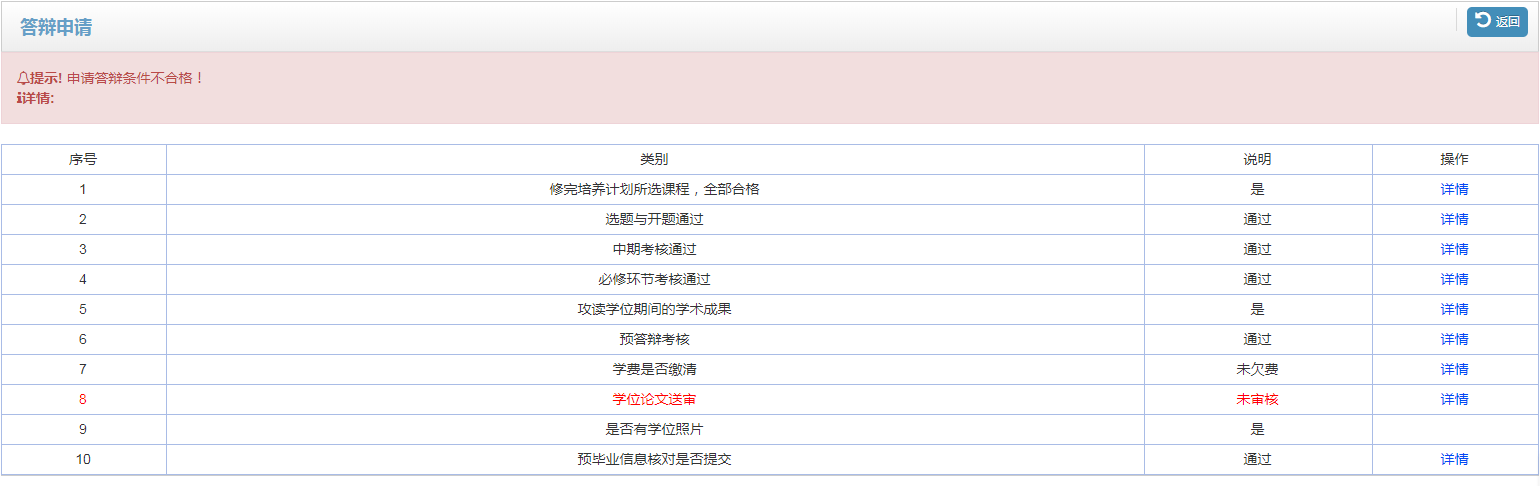 三、查看“答辩申请”功能模块,自查培养环节完成情况
